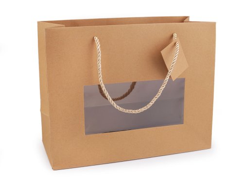 Dárková taška je vyrobená z kvalitního pevného papíru, z přední strany ji zdobí plastový průhled. Ucha jsou ze [saténové šňůry.] Do tašky můžete zabalit např. svíčky, kosmetiku či menší oděvy. Tašku také můžete dle svého vkusu dozdobit. Rozměry průhledu jsou [8 x 17 cm.]
