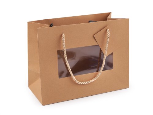 Dárková taška je vyrobená z kvalitního pevného papíru, z přední strany ji zdobí plastový průhled. Ucha jsou z kroucené saténové šňůry, najdete na nich papírovou jmenovku. Do tašky se vejdou dárky menší velikosti, např. svíčky, kosmetika či šátek. Tašku také můžete dle svého vkusu dozdobit. Rozměry průhledu jsou 6 x 13 cm.