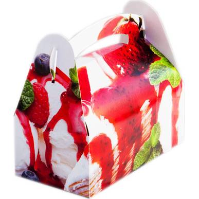 "Taštička z barevného potištěného papíru s barevným potiskem pro bezpečné přenášení různých druhů zákusků, cukroví, koláčů a dalšího pečiva. Rozměry 18 x 10 cm".