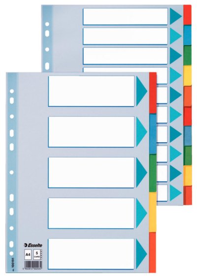 Rozlišovače z kvalitního silného kartonu Jednotlivé stránky v různých barvách Formát: A4 Barevné třídění Popisovatelný titulní list pro snadnou orientaci v zakládaných dokumentech Univerzální multiperforace …