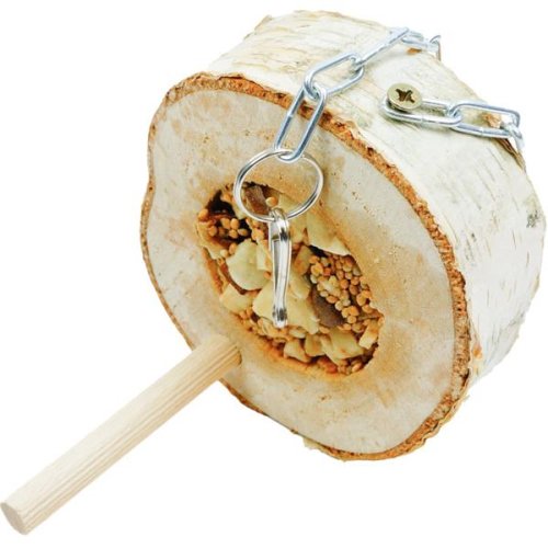 Řez březové větve naplněný lahodnou ovocnou směsí zavěšený na řetízku s karabinkou pro snadné připevnění v kleci. Březové kolo má otvor pro zasunutí dřevěného bidýlka, které je součástí balení. Vznikne tak interaktivní hračka pro zabavení osazenstva klece a zároveň chutný a zdravý pamlsek. Proměňte klec v papouščí ráj! Přednosti pamlsků Paradise Parrot: