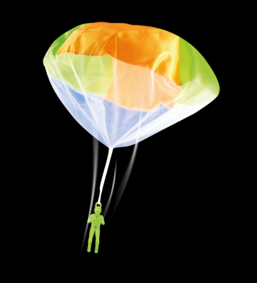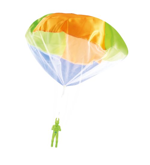 Plastová postavička svítícího parašutisty s padákem. Tato hračka jistě potěší každého malého dobrodruha. Hračka ideální na hrátky na zahradě. Běhej a vyhazuj parašutistu do největší výšky, překonávej délku jeho letu! Při pádu se padák nafoukne a zpomalí pád panáčka - jako opravdový parašutista! Baterie 3x AG3 jsou součástí výrobku. Rozměry balení 19 x 29 x 4 cm. Vhodné pro děti od 3 let.