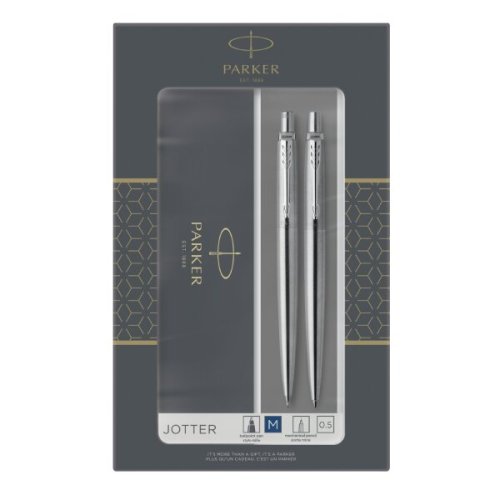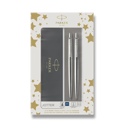 Kuličkové pero (propiska):, * stiskací mechanismus, * modrá nebo černá náplň pro kuličková pera - dle skladové dostupnosti, Mechanická tužka (mikrotužka):, * stiskací mechanismu, * tuha HB o síle 0,5 mm, Vyrobeno ve Francii. Dodáváno v dárkové kazetě. (Podoba balení dle skladové dostupnosti)., Parker Jotter je designérskou klasikou a důvěrně známou modelovou řadou, oceňovanou zejména pro svou kvalitu, spolehlivost a příznivý poměr ceny a výkonu. Jedná se o nadčasový model,, který i díky široké nabídce povrchových provedení a praktickému, jednoduchému tvaru patří mezi nejoblíbenější., TIP: Kupte si rovnou i náhradní náplň Parker do kuličkového pera.