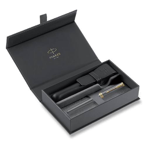 Dárková kazeta obsahuje:, * plnicí pero Parker Sonnet Core Grey GT, * černé kožené pouzdro Parker, * voucher Akademie psaní