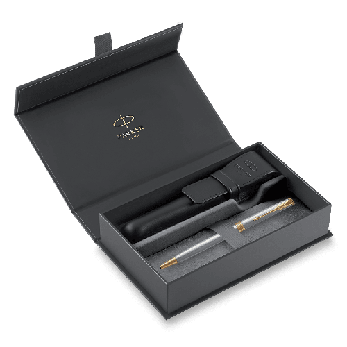 Dárková kazeta obsahuje:, * kuličkové pero Parker Sonnet Stainless Steel GT, * černé kožené pouzdro Parker, * voucher Akademie psaní