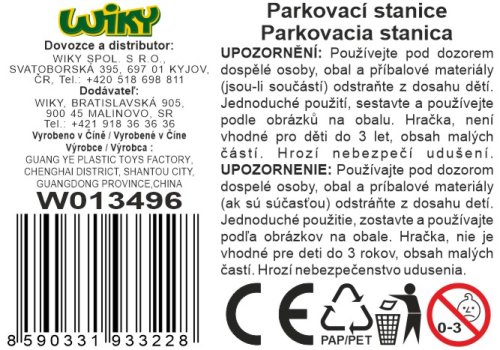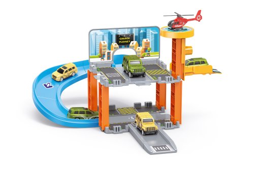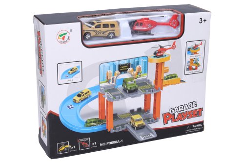 Rozměry 34,5 x 39,5 x 20 cm. Součástí jedno auto (volná kola), jeden vrtulník, heliport a manuální výtah.