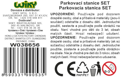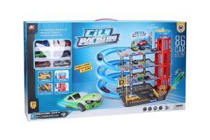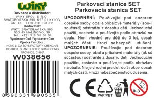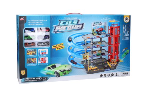 Parkovací stanice se 6 kovovými auty. Rozměry 55x40x44 cm. Velikost auta 7 cm. Stanice obsahuje 6 kovových aut, ruční výtah, čerpací stanici, nabíječku elektrických aut, zvedací plošinu, závoru.