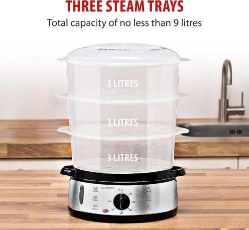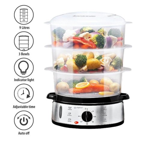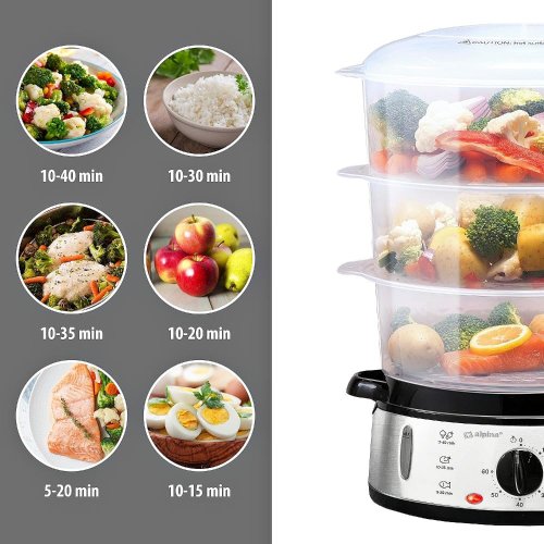 Parní hrnec Alpina umožňuje vařit různé druhy zeleniny, masa a dalších potravin najednou díky 3 přiloženým nádobám s celkovou kapacitou 9 litrů. Součástí je i samostatná nádoba na přípravu rýže. Časy přípravy různých potravin jsou: