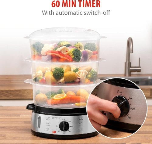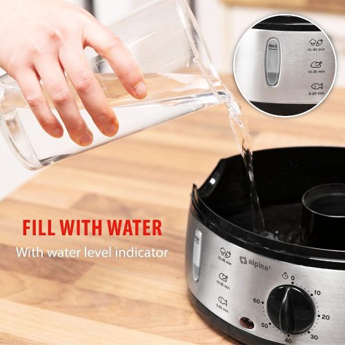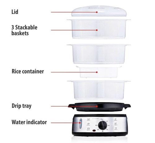 Připravte si jídlo zdravě bez ztráty chuti a vitamínů pomocí parního hrnce Alpina. Tento 3-vrstvý parní hrnec umožňuje připravit kompletní jídlo najednou. V parním hrnci můžete snadno vařit zeleninu, rýži, ovoce, kuře, ryby a vejce pro lahodné a výživné jídlo. Použití parního hrnce je skvělý způsob, jak připravit zdravé pokrmy. Díky funkci udržování teploty můžete také udržovat jídlo teplé v hrnci až do podávání. Nádoby jsou bez BPA a vhodné do myčky, což usnadňuje jejich čištění po použití.