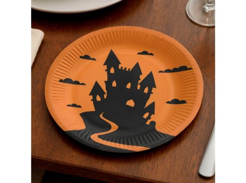 Papírové talířky s vtipnými motivy dýní, duchů a netopýrů v pestrých barvách. Skvělé pro dětské halloweenské oslavy. Průměr 23 cm, balení obsahuje 8 kusů.