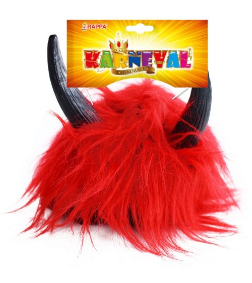 Karnevalová paruka v motivu ďábla. Paruka má krátké červené vlasy, krátkou ofinu a je dekorována rohy.
