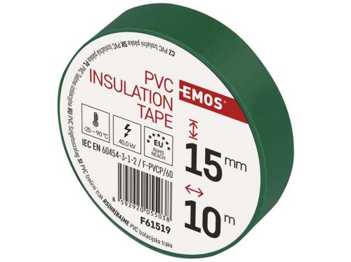 šířka: 15 mm délka: 10 m tloušťka: 0,13 mm materiál: PVC barva: zelená pevnost v tahu: 150 N/10 mm elektrická pevnost minimálně: 40 kV/mm prodloužení minimálně: 125 % elektrická pevnost po vlhku minimálně: 35 kV/mm zkouška plamenem: přilnavost k oceli minimálně: 1,8 N/10 mm přilnavost k podkladu: 1,5 N/10 mm doporučená skladovací teplota: 10–45 °C rozsah instalačních teplot: -25–90 °C splňuje směrnici ROHS splňuje směrnici REACH vyhovuje normě: ČSN EN 60454-3-1-2/F-PVC/60 odolné UV vodotěsný spoj materiál lepidla: kaučuk předpokládané použití: izolace kabelů samozhášivé