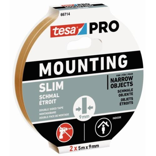 tesa PRO Mounting Slim– silná a tenká páska– ideální pro použití v interiéru u různých povrchů– oboustranná lepicí vrstva pro fixaci objektů užších než normální páska bez hřebíků či šroubů se hodí tesa …