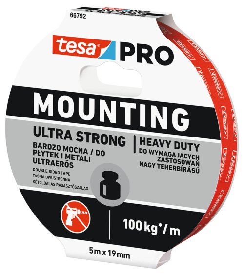 Páska montážní Ultra Strong 19 mm x 5 m TESA. rozměry: 19 mm x 5 m Naše nejsilnější montážní páska se hodí k bezpečnému upevnění objektů nastálo.