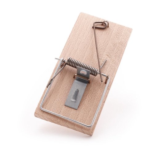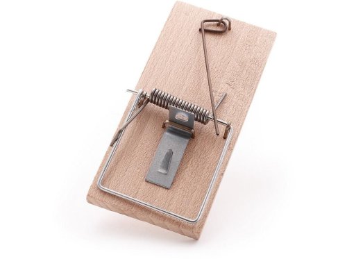 Klasická dřevěná sklapovací past na myši s bukovou základnou. Opatří se vhodnou návnadou, natáhne se a zajistí. Jako návnadu lze použít sýr, salám, slaninu, oříšky, případně i sladce vonící potraviny.