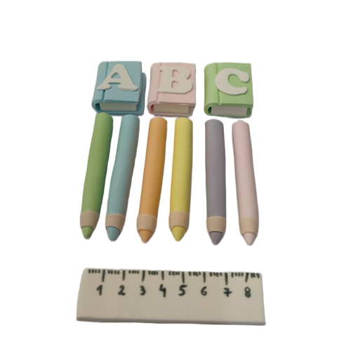 Ručně modelovaná sada pastelek, pravítka a písmenek vytvoří na dortu veselou školní atmosféru plnou barev, tvoření a radosti.