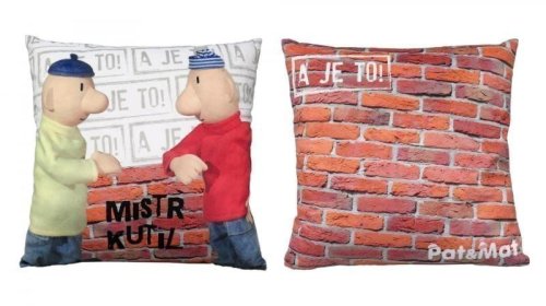 Měkoučký polštářek s oboustranným potiskem motivem oblíbených kutilů Pata a Mata.