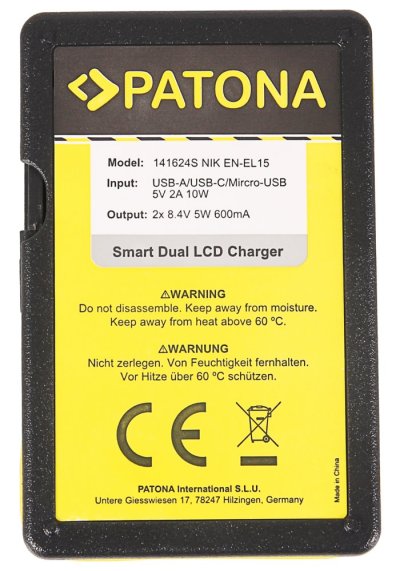 S nabíječkou Patona DUAL lze nabíjet současně 2 baterie najednou, bez ohledu na to, zda mají obě baterie stejnou kapacitu. Na LCD se zobrazuje aktuální stav nabití baterie. Nabíječky jsou vyráběny dle nejvyšších evropských standardů kvality a vyznačují se extrémně dlouhou životností. Nabíječku lze napájet skrze micro USB, USB-A či USB-C port.