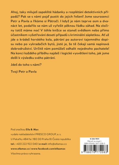 Pusťte se do rozplétání zapeklitých hádanek a detektivních případů společně se sourozenci Petrem a Pavlou, kteří si říkají Pátrači. Je jim teprve osm a dvanáct let, ale podařilo se jim už vyřešit pěknou řádku záhad. Na zločiny totiž mají nos! V téhle knížce se stanete svědky nebo přímo účastníky vyšetřování deseti případů s kriminální zápletkou. Ať už jde o krádež horského kola, pátrání po autorovi tajemného dopisu nebo po vykradačích bytů, jisté je, že vás čekají samá napínavá dobrodružství. Na konci každého příběhu najdete i logické vysvětlení toho, jak sourozenci došli k výsledku svého pátrání.