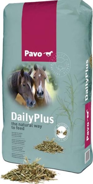 Složení: Vojtěška, ovesná řezanka, ječná sláma, krmná pšenice, třtinová melasa, tráva, ječmen, sójový olej, oxid hořečnatý. Analytické složky: Energie - 0,54 EWpa, stravitelná energie - 7,8 MJ/kg, Energie - 6,4 MJ/kg, stravitelný hrubý protein - 6,8 %, hrubý protein - 10,5 %, hrubé oleje a tuky - 2,4 %, hrubá vláknina - 26 %, hrubý popel - 9 %, cukr - 8,9 %, škrob - 3,2 %. Způsob použití a dávkování: Ideální pro koně a poníky všech ras a pro koně všech sportovních disciplín. Pro (sportovní) koně, kteří jsou krmeni jadrným krmivem: krmte obvyklou dávku krmení a přimíchejte 0,5 kg (= 2 hrsti) Pavo DailyPlus. Pro koně, kteří žerou pouze trávu nebo mají tendenci tloustnout: protože Pavo DailyPlus obsahuje méně energie, jsou velmi dobré i pro koně s nadváhou. Vezměte 0,5 kg (= 2 hrsti) Pavo DailyPlus a rozdrobte minerální briketu (Pavo SummerFit) i do žlabu. Tímto zamezíte nespokojenosti koně, když jsou krmeni ostatní a přitom zvyšujete dobrý pocit svého koně.