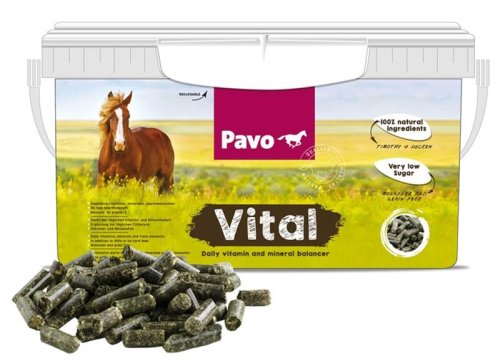Pavo Vital je doplněk pro denní použití: granule s obsahem všech vitaminů a minerálních látek, které váš kůň potřebuje, vyrobený ze 100% přírodních surovin a neobsahuje zbytečné doplňkové látky. Pavo Vital je unikátní díky obsahu nové formy stopových prvků - Intellibond®. Normálně mají stopové prvky jako je měď a zinek pro koně špatnou chuť, a tak doplňky s obsahem těchto prvků nejsou často chutné. Ale speciální Intellibond® stopové prvky jsou rozloženy v žaludku (ne v hubě) koně. Proto nemají negativní efekt na chutnost! Společně s přídavkem bojínku lučního a vojtěšky jsou Pavo Vital velmi chutné granule!