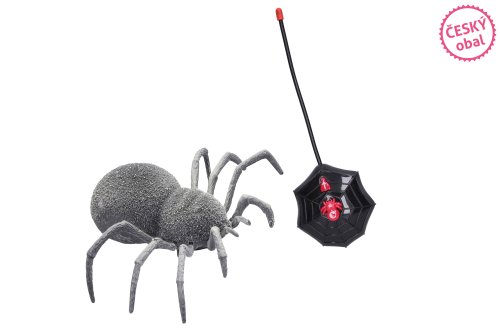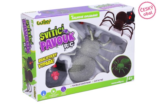 Pavouk RC na dálkové ovládání. Velikost 20 x 13 cm. Svítí ve tmě. Dosah ovladače 4 m. 2 tlačítka, pohyb dopředu a otáčení. Pavouk 2xAAA, ovladač 2xAA nejsou součástí.