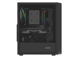 Futuristický geometrický tvar se bude líbit jak hardcore hráčům, tak i těm, kteří dávají přednost decentnějšímu designu. Levý boční panel z tvrzeného skla je příležitostí k odhalení vnitřku skříně a výkonných komponent ukrytých uvnitř - také s RGB, zejména proto, že instalovaný ventilátor je předsvícený.