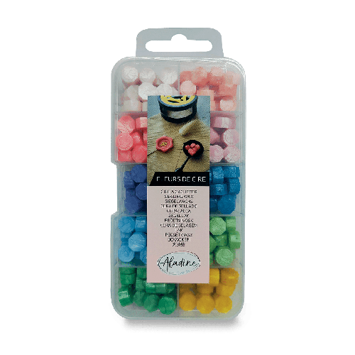 Vosk ve formě granulí na výrobu pečetí, kterými ozdobíte svatební oznámení, pozvánky, chlopně obálek, dárky i kreativní projekty. Používají se společně s pečetní sadou. Do teflonové lžičky se umístí 3–4 granule vosku, použít lze různé barvy pro mramorovaný efekt. Lžička se nahřeje na stojánku nad plamenem čajové svíčky. Po roztavení se vosk ze lžičky nalije na požadované místo a vtiskne se do něj kovové pečetidlo. Obsahuje 10 perleťových barev, rozměr balení 13 x 6,5 x 2 cm.