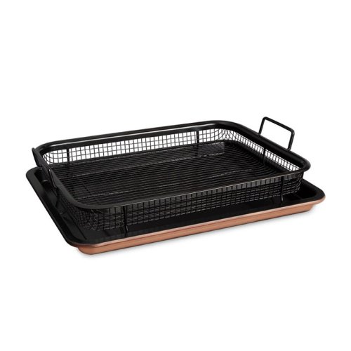 Tato sada pečicího tácu s kovovým košem je vyrobena z uhlíkové oceli s titanovou nepřilnavou vrstvou, která zajišťuje vysokou kvalitu a odolnost. Sada obsahuje kovový koš z nerezové oceli. Velikost tácu je 32,5x24,5x2 cm a velikost košíku je 30x20,5x3,5 cm. Metalická růžová zlatá barva a elegantní design dodávají této sadě moderní vzhled, který se hodí do každé kuchyně.
