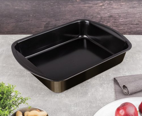 materiál: uhlíková ocel - třívrstvý titanový nepřilnavý povrch - barva: černá Carbon - rozměry: 35 x 27 cm - výška: 6,5 cm - rozměry vnitřního dna: 29 x 24,5 cm - vhodné do trouby do teploty 240°C - jednoduché čištění - ECO FRIENDLY - PFOA, Olovo, Kadmium FREE
