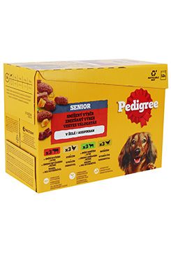 Kompletní vlhké krmivo pro starší psy. Váš pes si pochutná na čtyřech příchutích, smíšený výběr v želé se směsí hovězího a jater, s kuřecím, se směsí jehněčího a jater, s drůbežím.
