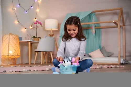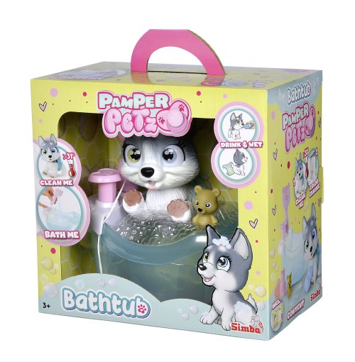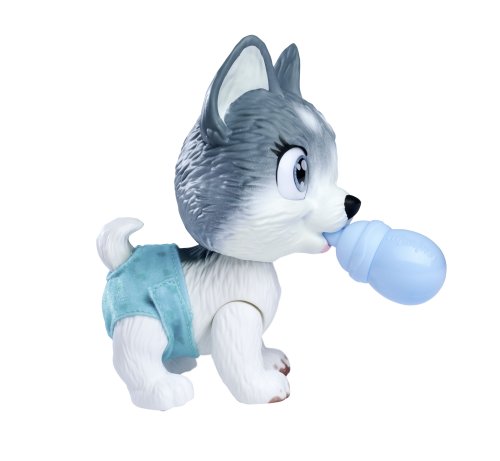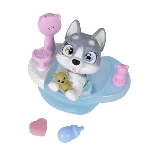 Roztomilé psí miminko s picí a čůrací funkcí s picí lahvičkou, plenka s funkcí změny zbarvení po namočení, magická tlapka (po umytí vlažnou vodou zmizí zabarvení), vana s pumpovací funkcí, včetně koupelových doplňků. Velikost 25 cm.