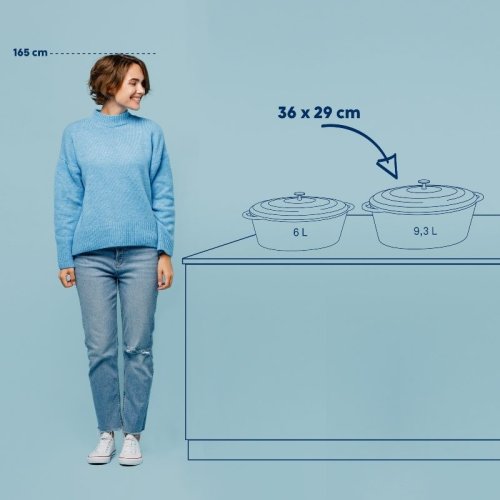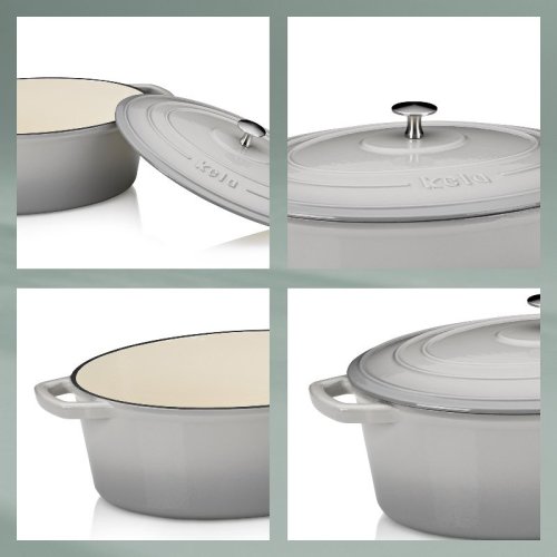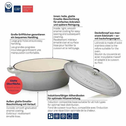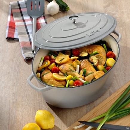Ze série kela Calido: Oválný pekáč v šedé barvě s lesklým povrchem a víkem je dlouhý 36 cm, široký 29 cm a má objem 9,3 litru. Celková délka včetně držadel je 44 cm. Tento šedý kastrol je vyroben z litiny a uvnitř je smaltován béžovou barvou. Pekáč je ideální pro opékání masa (do 300°C) a pro dušená jídla, která by se měla dusit ve vlastní šťávě po dlouhou dobu. Pekáč s poklicí je součástí rozsáhlého sortimentu nádobí!Smaltovaná litina světle šedá/béžová 36x29cm, 15cm v, 9,3L