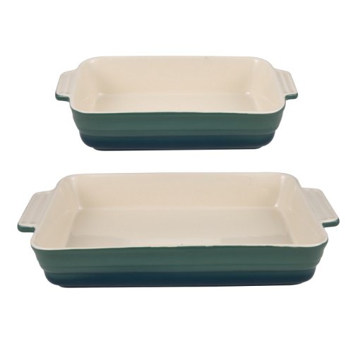 • Sada 2 obdélníkových forem na pečení: 1 forma o rozměrech 31 x 19 x 5,2 cm a jedna forma o rozměrech 37 x 21 x 7 cm. • Vyrobeno z vysoce odolné kameniny. • Interiér v krémové barvě. • Exteriér v odstínech zelené. • Stohovatelný výrobek. • Vhodné do trouby, mikrovlnné trouby, lednice a myčky.Excalibur přináší do vaší kuchyně efektivní a sofistikované kuchyňské nádobí s barevným nádechem. Sada 2 obdélníkových pekařů o rozměrech 31 x 19 x 5,2 cm a 37 x 21 x 7 cm, stohovatelná sada, která vyřeší vaše problémy se skladováním. Jsou vyrobeny z vysoce kvalitní kameniny, jsou extrémně odolné a trvanlivé a udržují teplotu, aby nabídly produkt na stole v jeho optimálním bodě a zároveň šetří energii. Vařte v troubě, ohřívejte jídlo v mikrovlnné troubě nebo je uchovávejte v lednici, cokoli potřebujete. Kolekce připomínající staromódní kuchyni s přechodově zeleným designem, s interiérem v krémové barvě, který zdokonalí vaše přípravy a s uchy je můžete podávat, kde si budete přát. Kompletní sada, která se snadno čistí v myčce, takže je můžete použít tolikrát, kolikrát potřebujete.