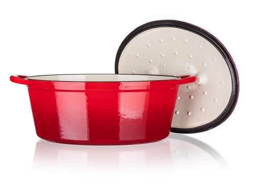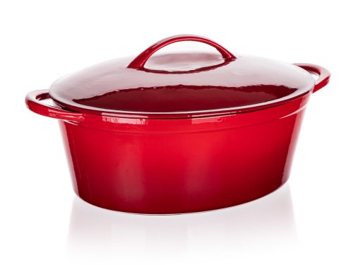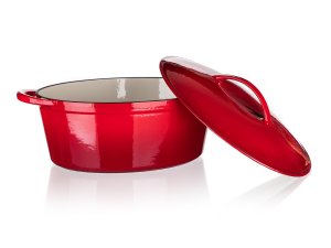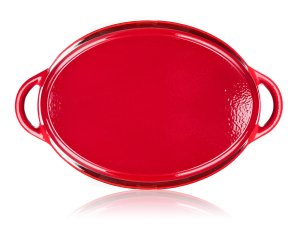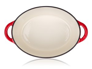 Litinový pekáč EXCELLENT s víkem, v červené barvě. Oválný pekáč s poklicí z litiny se smaltovaným povrchem je ideální pro pečení a zapékání v troubě, stejně jako k vaření, dušení či smažení na plotýnce sporáku. Litina je pro vaření a pečení naprosto ideální. Masivní materiál, který jakmile se nahřeje, vydrží dlouho a rovnoměrně rozvádí teplo, díky němuž se pokrm v litinovém pekáči upeče rovnoměrně, za kratší dobu a úsporněji. Vnitřní smaltovaný povrch je nepřilnavý, vysoce odolný proti odření a praskání a jelikož se potraviny nepřipalují, je také velmi nenáročný na údržbu. Výstupky na vnitřní straně poklice zajistí rovnoměrné odkapávání zkondenzované páry zpět do hrnce, pokrm se nevysušuje a zůstává šťavnatý. Pečení v troubě je vhodné max. do 280 st. C.