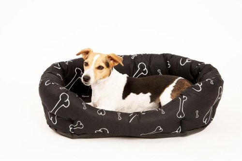 Pohodlný, kvalitní pelech vyrobený z bavlněné látky potištěné kostmi a kostičkami, vyplněný dutým vláknem. Pelíšek je v několika bodech prošitý, aby nedošlo k nerovnoměrnému rozmístění výplně. Polštářek je vyjímatelný. Boky pelíšku jsou kvůli dobré opoře bohatě vyplněny. Pelech se lehce udržuje.