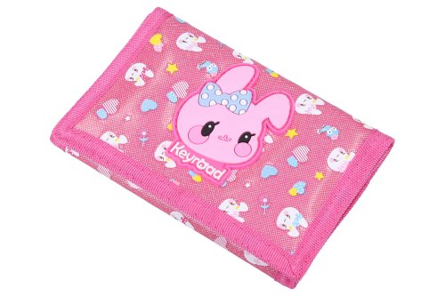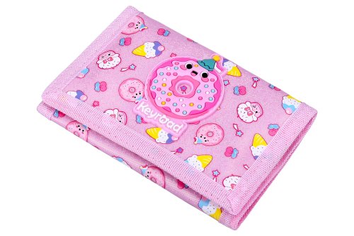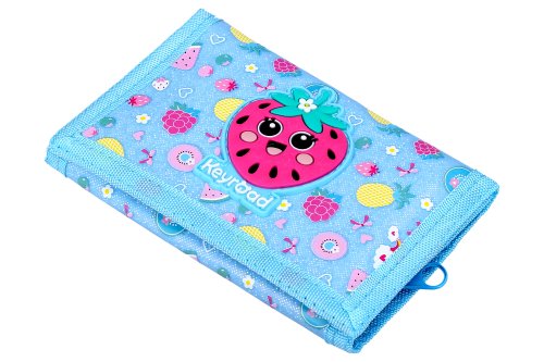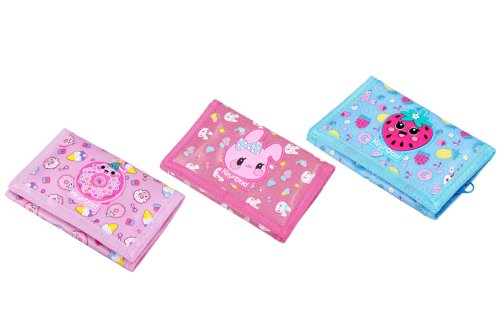Modrá peněženka s jahodou. Růžová peněženka s koblihou. Červená peněženka se zajícem.