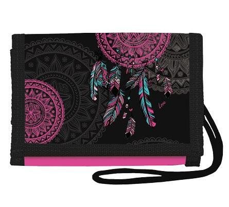 Praktická peněženka na krk má na vnější straně průhlednou kapsičku na průkazy či karty. Uvnitř je praktický organizér s 5 kapsičkami na bankovky a drobnosti, kapsička na zip na mince a kovový kroužek na klíče. Peněženka se zavře suchým zipem a zavěsí na krk látkovou šňůrkou.