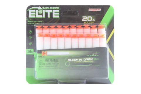 Náhradní pšnové náboje s přísavkou ,které ve tmě svítí o rozměru 7x 1,3 cm, 20 ks v balení.Rozměr balení cca 17 x15,5 x 3,5 cm.Věk 3+