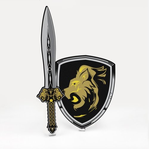 „Dětský pěnový meč a štít s motivem lva pro malého samuraje. Souprava je vyrobena z pěny a je velmi bezpečná. Vhodné jako doplněk ke karnevalovému kostýmu.“