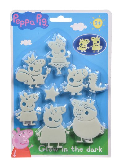 Sada figurek ze seriálu Peppa Pig a dalších obrázků, které po nasvícení ve tmě zpříjemňují usínání menším i větším dětem. Možno nalepit na stěnu, strop, nábytek apod. Obsahuje 20 ks.
