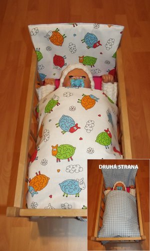 SDS Peřinky do postýlky pro panenky Ovečky barevné/Kostička modrá Peřinky do postýlky pro panenku Ovečky jsou vyrobeny ze 100% bavlny. Výplň Peřinek je ze 100% polyesteru - vatelín (pevně všitý do peřinky, gramáž 200gr/m2) Rozměr peřinky 38x44 cm Rozměr polštářku 28x20 cm Peřinky mají z jedné strany motiv barevných oveček a z druhé strany modré kostičky. Peřinky do postýlky pro panenku je možné si u nás nechat ušít na zakázku v jakémkoliv rozměru - termín dodání atypického rozměru je 5 - 10 prac dní. V případě zájmu napište rozměr peřinky do poznámky.