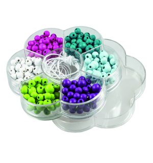 Sada obsahuje 30x6 různě velkých perliček od barvy a dva druhy různě širokých navlékacích nití.