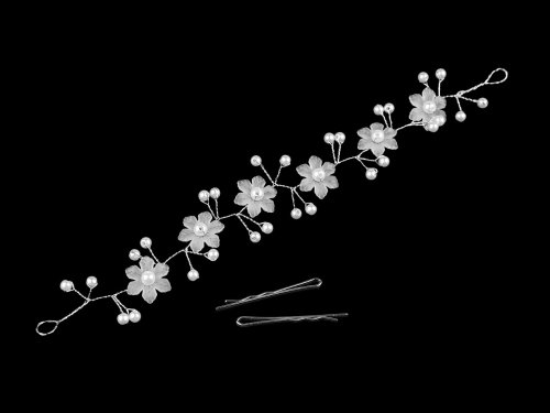 Romantická ozdoba s perlovými korálky bude jemným a elegantním doplňkem vašich vlasů. Je tvořená z dvou do sebe zapletených drátků, do kterých jsou vkomponované voskové korálky připomínající perly a další ozdoby. Díky drátkům je ozdoba lehce ohybatelná a lze ji prostorově tvarovat. Čelenku využijete jako nevšední doplněk na svatby, svaté přijímání či na plesy.Na vlasy ji upevníte pomocí vlasových sponek, které jsou součástí balení. Můžete ji přivázat i stuhou nebo pruženkou, kterou provléknete do oček (cca Ø7 mm) na koncích ozdoby. Stuha ani pruženka není součástí balení.