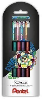 Dárková sada čtyř gelových per Pentel Pentel Hybrid Dual Metallic v barevné kombinaci ORANGE/METALLIC YELLOW, GREEN/METALLIC BLUE, VIOLET/METALLIC BLUE, PINK/METALLIC PINK. Hybrid Dual Metallic obsahuje glitry. Třpytivá sytá stopa mění barvu podle použití na bílý nebo černý papír. Gelová stopa 0,9mm je stejnoměrná, rychleschnoucí. Inkoust je na vodní bázi, lze jej na akvarelovém papíru rozmývat do ztracena, ale třpytivé efekty zůstávají. Třpytky lze také odebrat z kuličky hrotu jemným nylonovým štětečkem Pentel Aquash a pracovat s nimi jako s dekorací. Případně kreslit na hladkou folii a z ní si za pomocí štětečku Pentel Aquash odebírat barevnou stopu a třpytky. Vhodné pro krasopis, bujo journal, zdobení, dekoraci, zvýraznění, tvoření. Odolné plastové tělo s víčkem. Příjemný šestihranný úchop. Třpytivá krycí stopa mění barvu podle použití na bílý nebo černý papír. Kónický hrot se stopou 0,9mm.