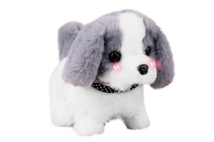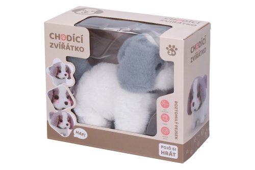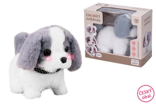 Pes chodící. Rozměry: 9x18.5x16cm. Kočka chodí, červená se, vrtí ocáskem. světelné a zvukové efekty. Baterie 2xAA nejsou součástí. Vypínač on/off