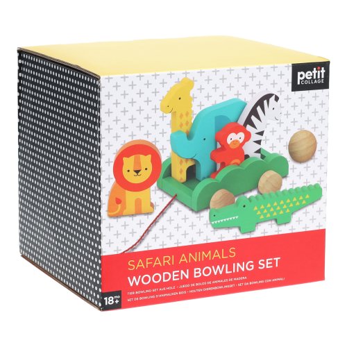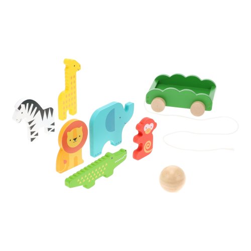 Pestrobarevné figurky usměvavých zvířátek ve vozíku čekají, až je děti rozestaví a pokusí se je povalit přibalenou koulí. Díky rozličným tvarům je srážení figurek různě obtížné. Zvířátka lze snadno využít i při mnoha jiných fantastických hrách. Hračka pomáhá rozvíjet hrubou motoriku, koordinaci pohybu a senzomotorické dovednosti. Hlavní vlastnosti:vozík, 6 figurek a koulehra a tahací hračka v jednom
