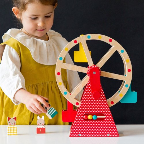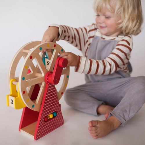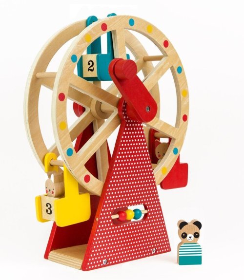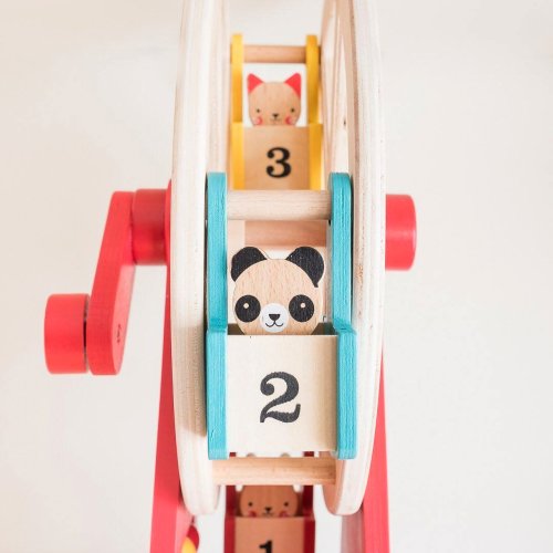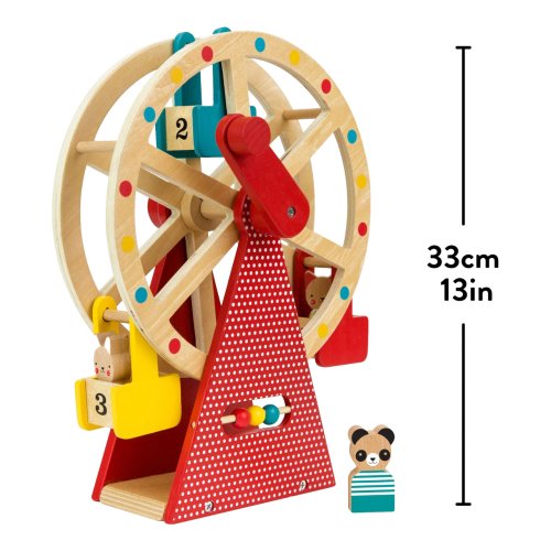 Vezměte své tři zvířecí přátele na projížďku na tomto krásně navrženém a stylovém dřevěném ruském kole. Otočte rukojeť a sledujte, jak se točí velké kolo! Použijte přiložené počítadlo například k počítání jízd. S rotujícím dřevěným ruským kolem se třemi vozíky a třemi zvířecími kamarády z bukového dřeva si užijete spoustu zábavy. Hlavní vlastnosti: Předem smontované a kvalitní dřevěné ruské kolo se otáčí pomocí kliky Obsahuje tři zvířecí kamarády z bukového dřeva Robustní dřevěná konstrukce kola je malována netoxickými barvami na vodní bázi Stylová hračka a krásný dekorační prvek v každém dětském pokoji Splňuje všechny bezpečnostní normy