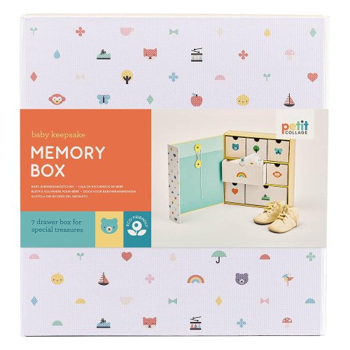 Krabička vzpomínek je ideální krabičkou na všechny dárky, které Vaše dítko dostane jako novorozeně od svých nejbližších. Tato ekologicky šetrná krabička vzpomínek od Petit Collage uchová všechny drahocenné dárky od prvního kusu oblečení až po první ostříhání. Hlavní vlastnosti: Obsahuje 7 šuplíčků a kapsu k uložení dárkůBaleno bez použití plastů
