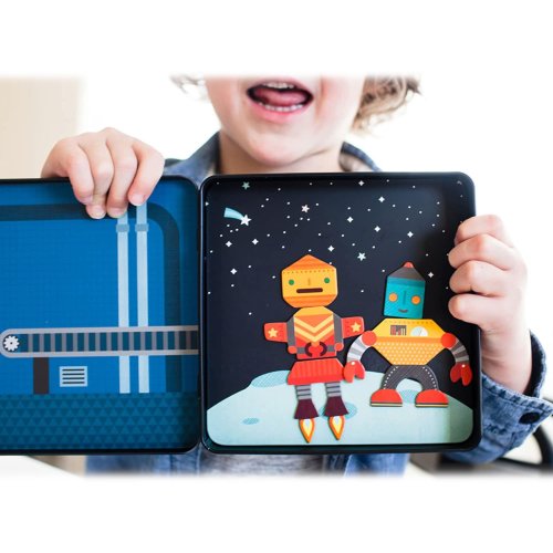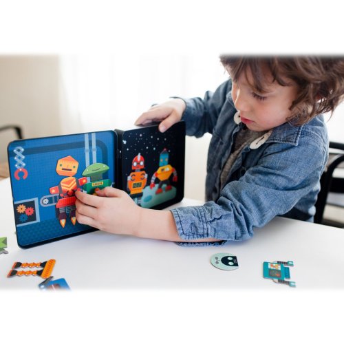 Připněte magenty na tabulku a vytvářejte různé postavičky robotů! Balení obsahuje přes 25 magnetických dílků, s kterými si děti dokáží vyhrát. Zabaleno v plechové krabičce, která se dá pevně zavřít, perfektní hračka na cesty. Plechová krabička má uvnitř, na stěnách, dvě scenérie. Hlavní vlasnosti: Podporuje představivost dětíNatisknuto netoxickými barvamiSplňuje všechny bezpečnostní normy